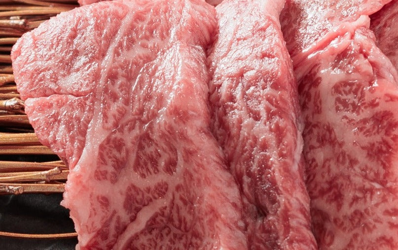 One of the representative characteristics of Wagyu beef is what is called “Sashi” or “Shimofuri.” It refers to the fat between lean meat which resembles marble, and is a characteristic of Wagyu beef only. This “Sashi” is greatly influenced by the bloodlines of cattle for generations. The years of research and crossbreeding of pedigrees brought about “Sashi,” the representative characteristic of Wagyu beef. “Sashi” is called "marbling" in English, and the B.M.S. (Beef Marbling Standard) is an evaluation standard for the quality of Wagyu beef.