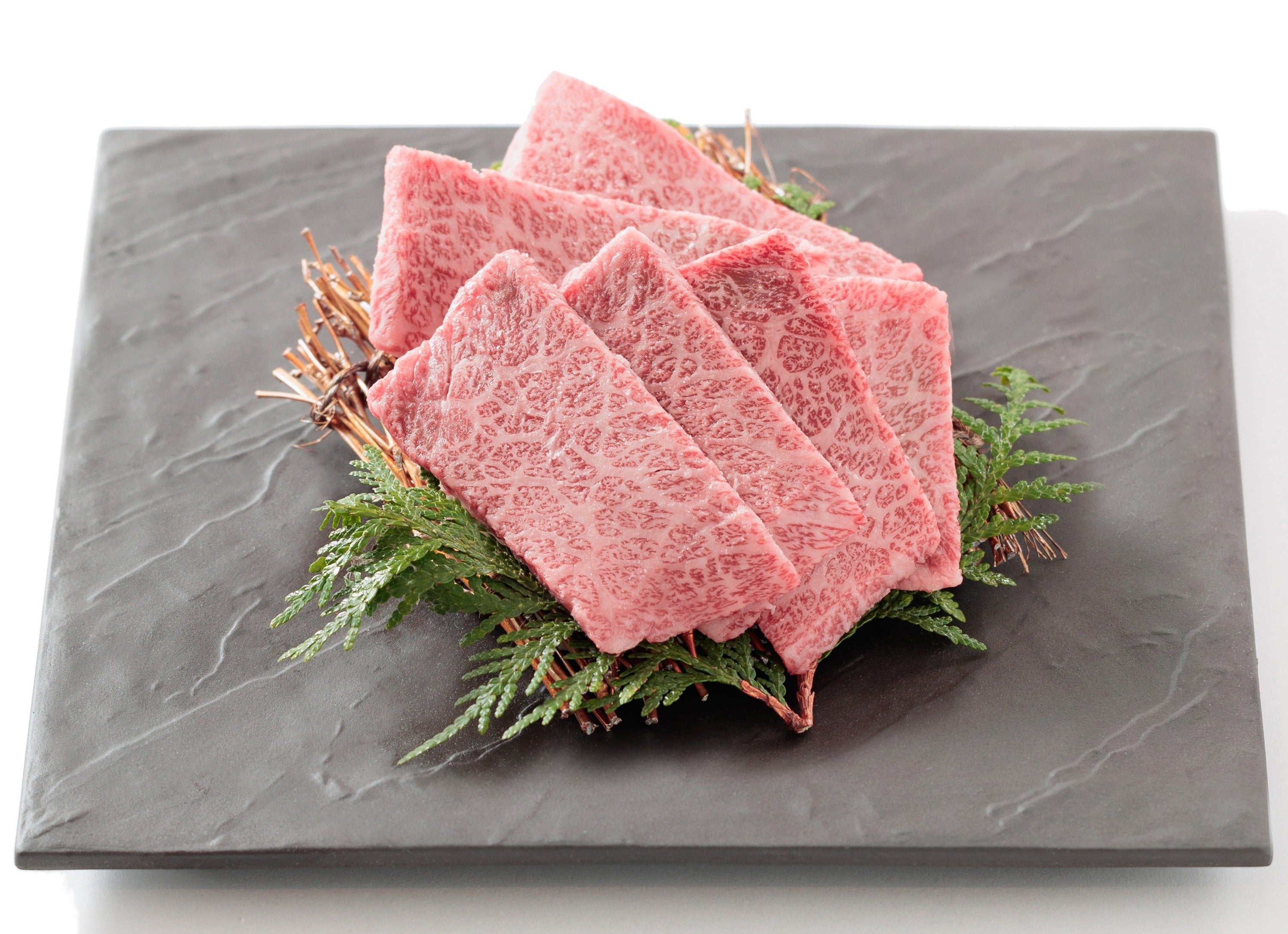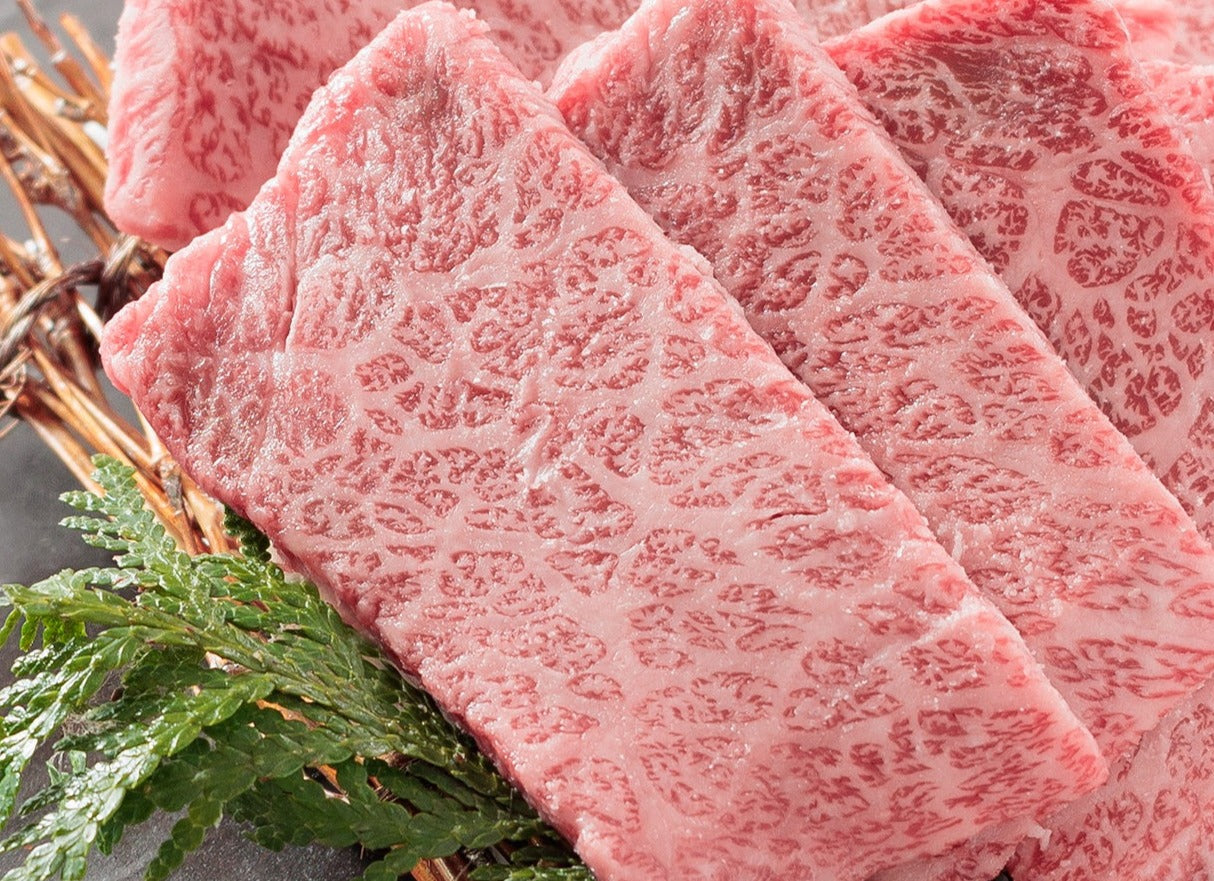One of the representative characteristics of Wagyu beef is what is called “Sashi” or “Shimofuri.” It refers to the fat between lean meat which resembles marble, and is a characteristic of Wagyu beef only. This “Sashi” is greatly influenced by the bloodlines of cattle for generations. The years of research and crossbreeding of pedigrees brought about “Sashi,” the representative characteristic of Wagyu beef. “Sashi” is called "marbling" in English, and the B.M.S. (Beef Marbling Standard) is an evaluation standard for the quality of Wagyu beef.